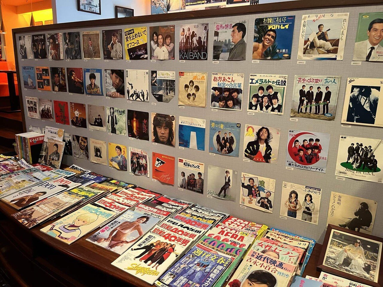 その一角でひときわ目を引くのが「レコード喫茶 グラフィティ」。外観から内装まで凝りに凝った店構えで、エルヴィスやフランク・シナトラなどオールディーズのジャケットが屏風のように並び、場末感と華やかさが同居する独特の空気を放つ。赤い椅子が印象的で、思わず上映されていいる映画『バック・トゥ・ザ・フューチャーII』に見入ってしまうような、どこかノスタルジックでポップな世界が広がる。