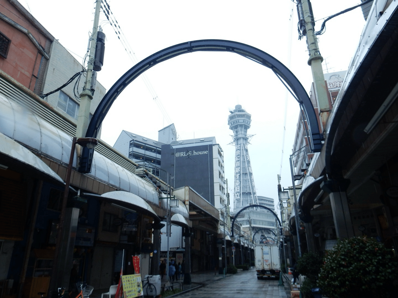 通天閣の膝元。雨の朝、路地の石畳がしっとりと濡れている。その一角に、白い暖簾を掲げた小さな店がある。