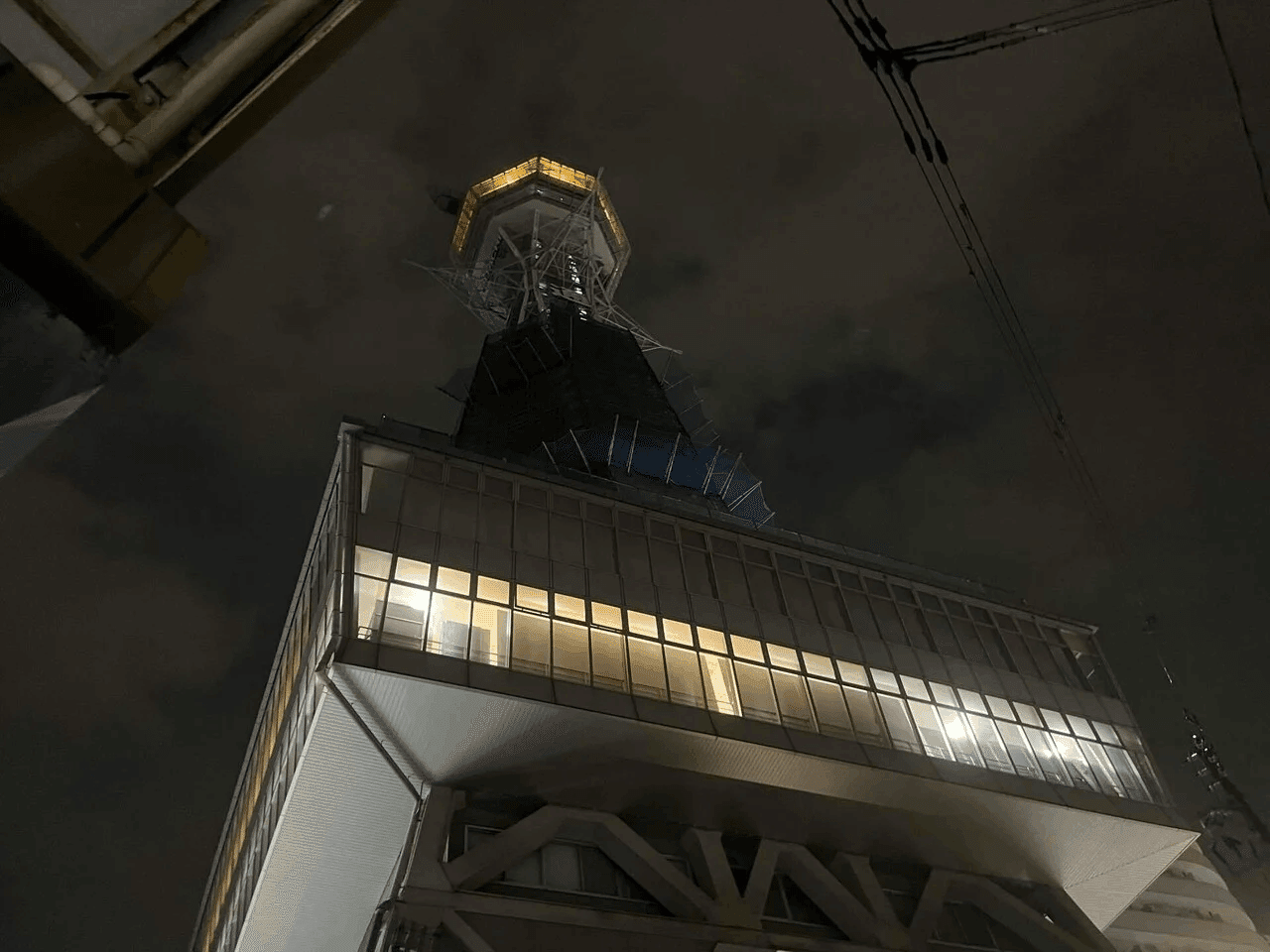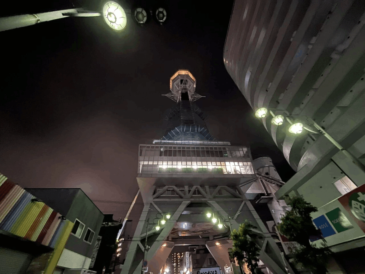 日付が変わった通天閣。灯りがついているのは工事中。銀幕に投影される光とともに、大切な新世界の街の灯。いつまでも永く照らし続けてほしい。9月の工事の完成が楽しみだ。