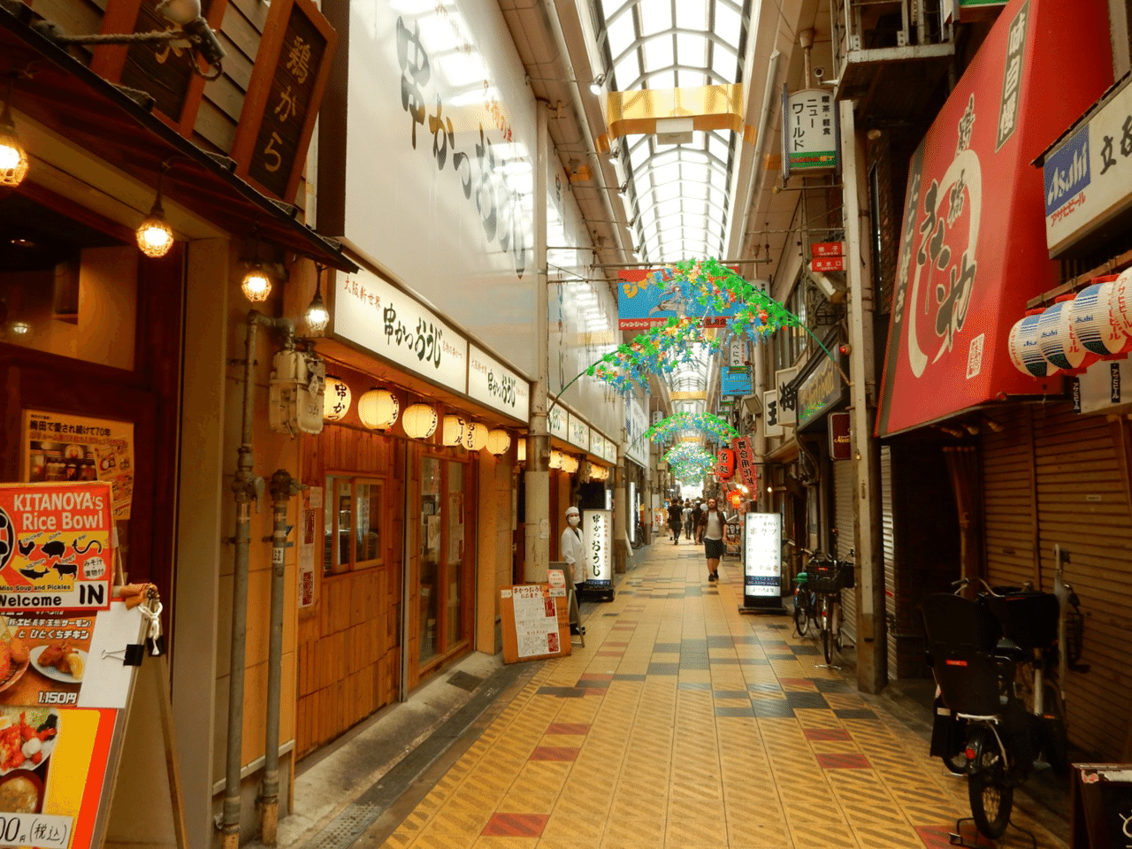 ジャンジャン横丁は大正時代から続く商店街。呼び込みの三味線の音がジャンジャン響いたことから名付けられた。せま〜い商店街に古き店が並ぶ。