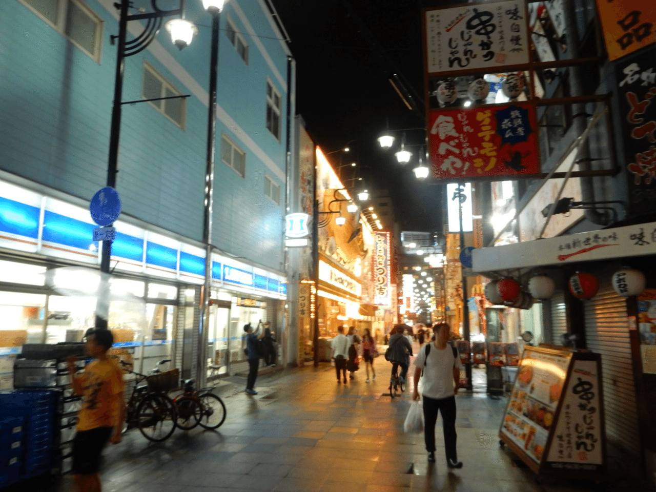 新世界の最後の夜は映画で締めたい。一眠りして21時30分にエビスホテルを出る。外は小雨。一部の串カツ屋さんが開いていて観光客もチラホラ。