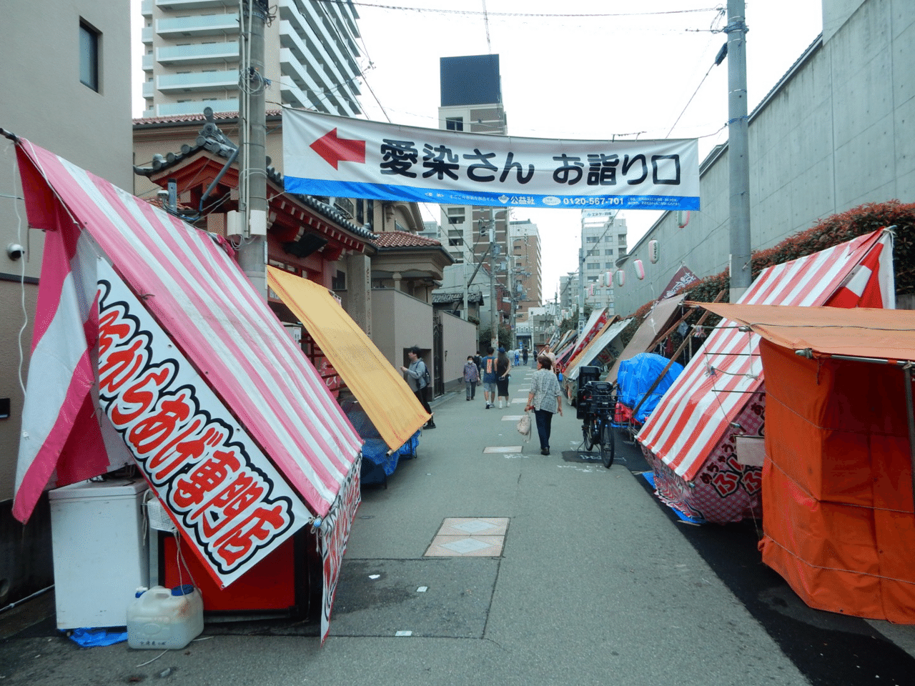 雨が少し降ってきた。愛染まつりの期間中は「愛染パラパラ」と呼ばれる小雨が降る。愛染まつりの道中で小雨に当たると結ばれる言い伝えがある。雨は恋人を結ぶ赤い糸。新海誠の『言の葉の庭』のようだ。