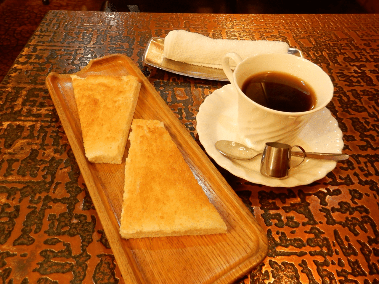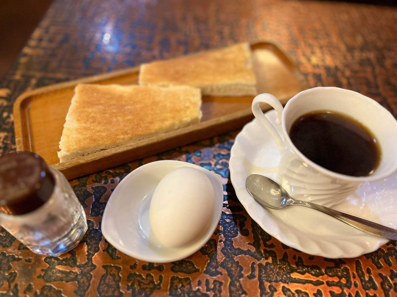 珈琲とトースト、そしてゆで卵の三点。450円。それは、昭和のまま時が止まった“朝の定義”のような一皿だ。焼きたてのトーストは、外は軽くザクッと、内はふんわり。口に入れると、わずかに残る塩気とバターの香りが広がり、それを追うように、酸味の立った珈琲が舌を洗い流していく。