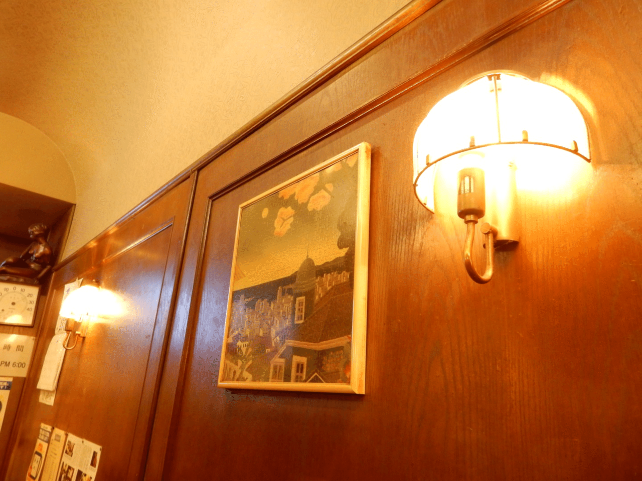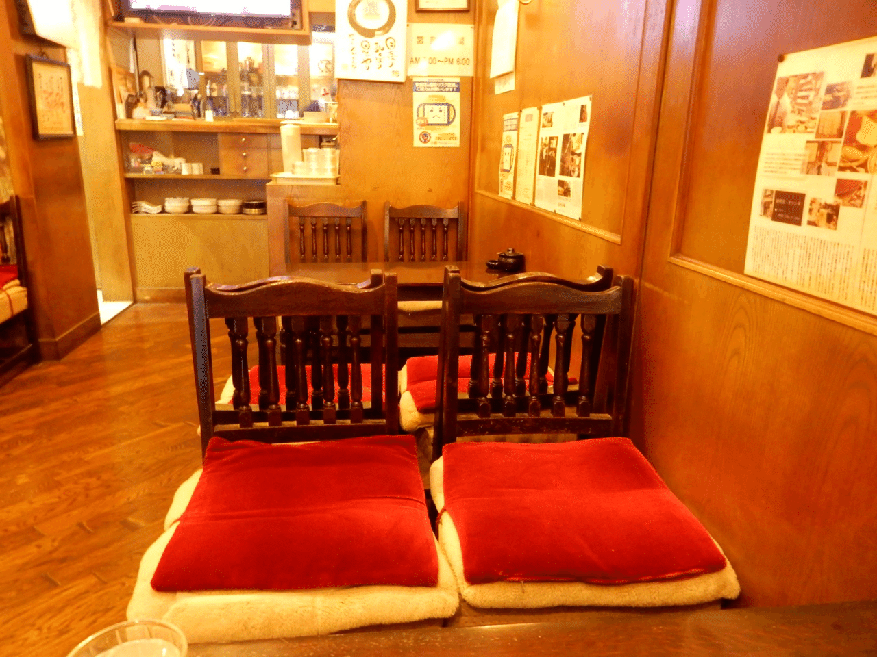 扉を開けば、そこは懐かしさと安らぎに満ちた世界。壁は濃い木目で、柔らかなランプの光が温もりを与える。赤いクッションを敷いたクラシカルな椅子、寄木張りの床、壁に貼られた記事の切り抜きや絵画が、時代を超えた空気を醸す。テレビから流れるワイドショーの音声すら、ここではBGMのように馴染んでいる。