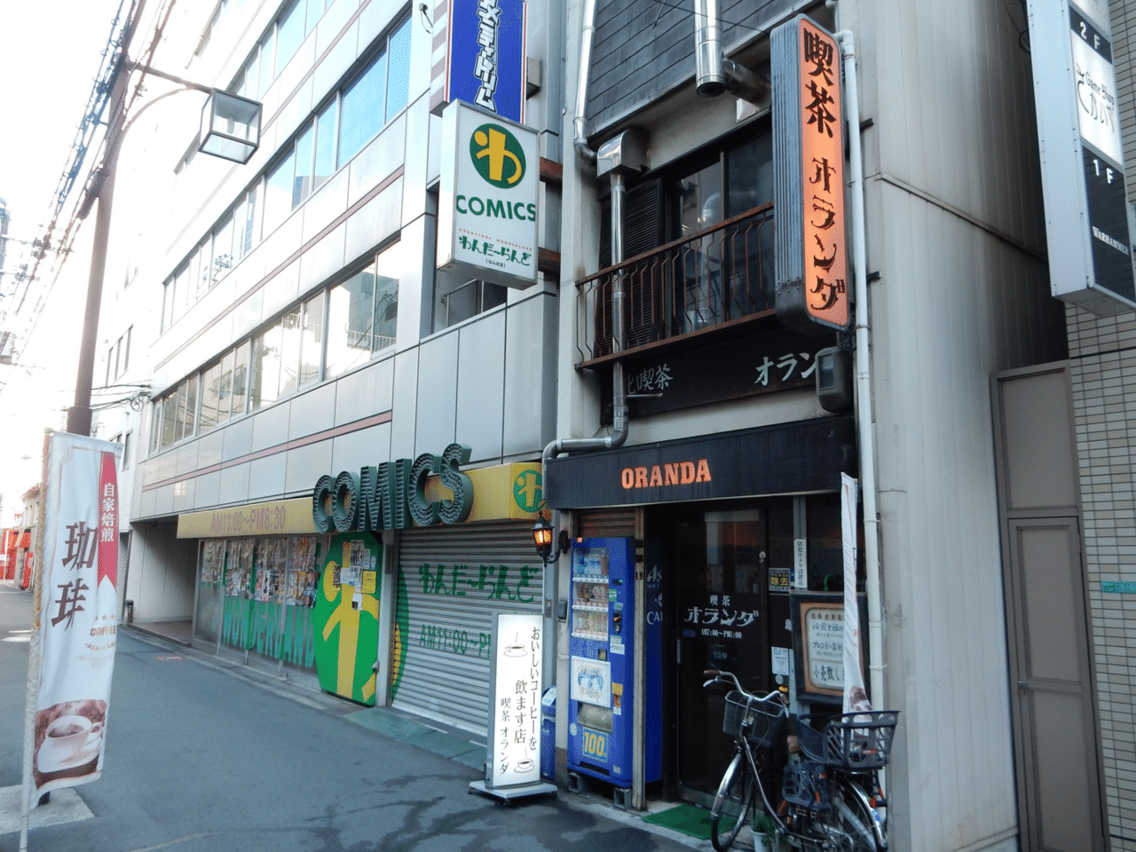 外観は、路地裏の雑居ビルの一角に黒い看板を掲げた小さな店構え。隣には古びたコミック店が並び、昭和と平成と令和がごちゃ混ぜになった風景のなかで、オレンジ色の「喫茶オランダ」の看板が妙に存在感を放っている。