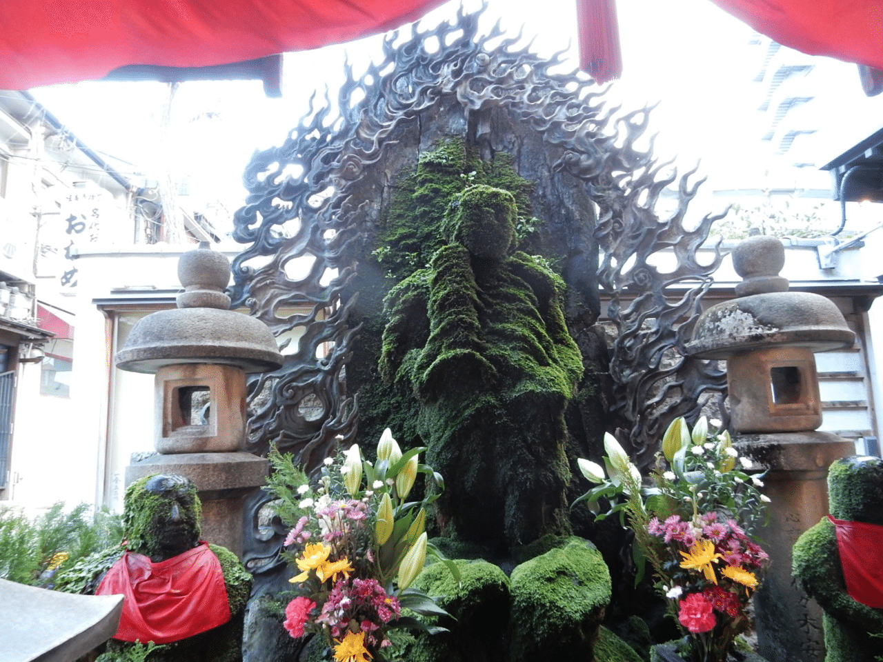入り口のガラス張りの陳列窓には阿多福人形が飾られ、赤提灯がずらりと並ぶ。織田作之助はここを「法善寺の主」と称えた。
