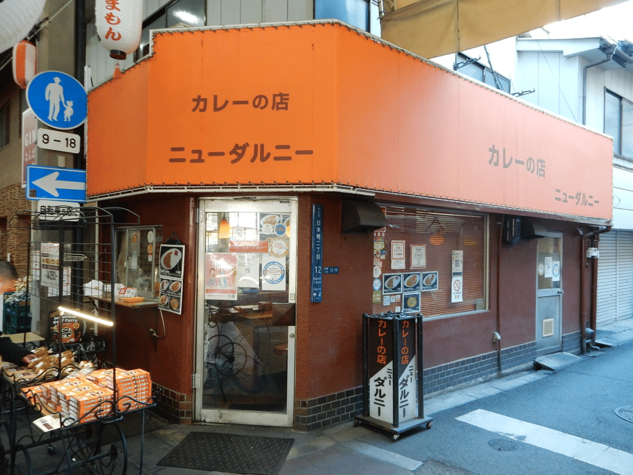 大阪のカレーといえば「自由軒」を思い浮かべる人は多いが、もう一つ、確かな存在感を放つ老舗がある。黒門市場の一角、堺筋の入り口に立つ「ニューダルニー」だ。堺筋から黒門市場へ足を踏み入れると、まずオレンジの看板が目に飛び込んでくる。その先には神戸牛の店が並び、やがて海鮮市場へと景色が変わっていくが、この香りこそが黒門の“入口の記憶”だ。