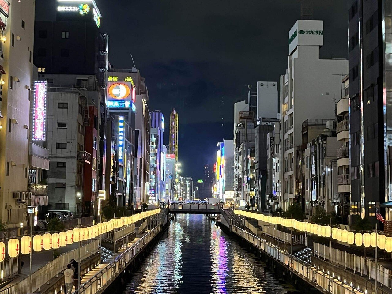 この日は「道頓堀川万灯」の開催期間で、深里橋から日本橋まで1300灯の提灯が川沿いを照らしていた。