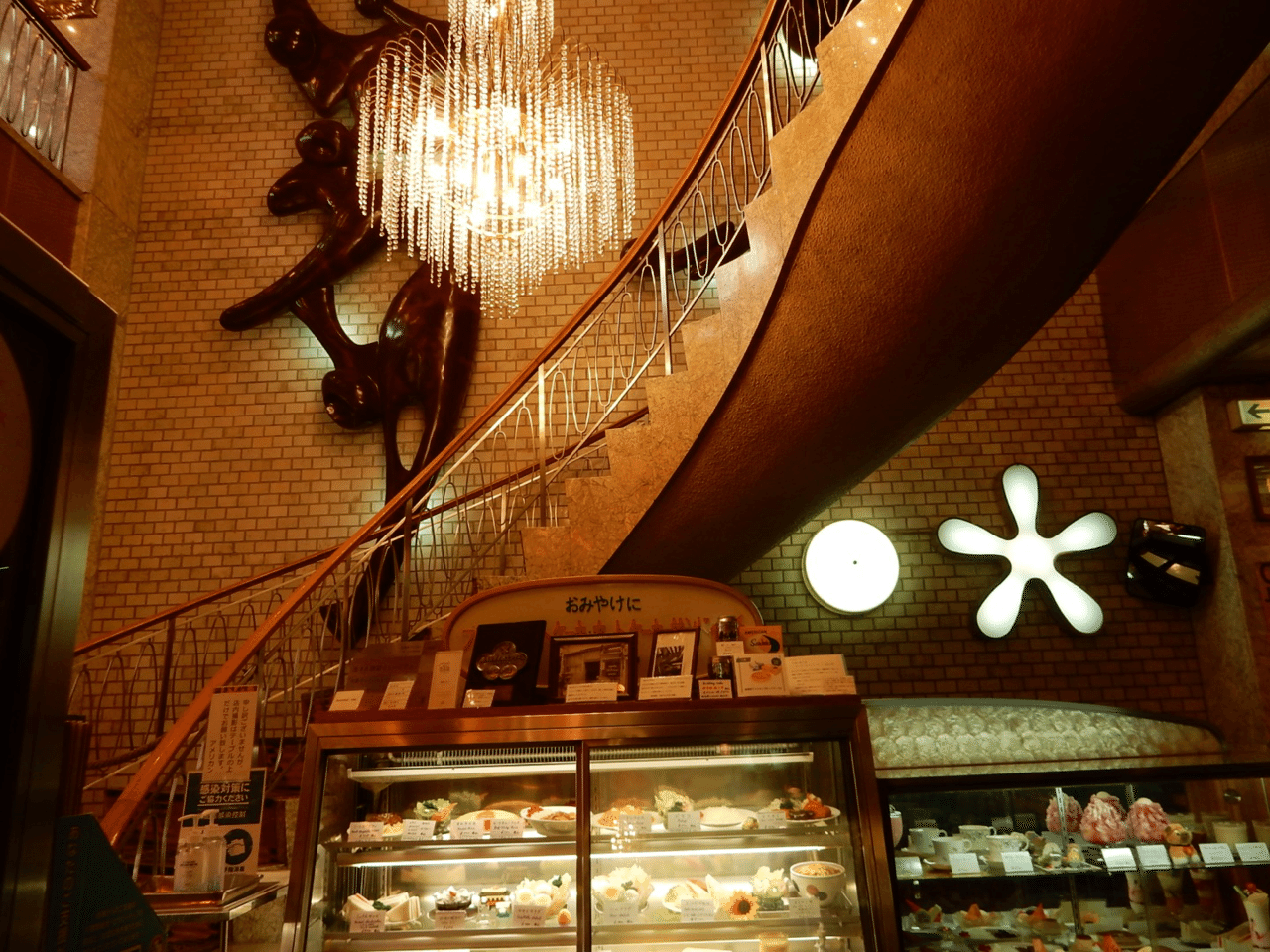 内観は、エントランスに設けられた優雅な螺旋階段がひときわ目を引く。店内に足を踏み入れると、1階には640枚の木材とステンドグラスを組み合わせた壁、2階には川島織物の緞通があしらわれ、ネオクラシックな雰囲気が漂う。季節の生花が飾られた空間は、訪れるたびに心を和ませてくれる。大阪で初めて観音開きの自動扉やジュークBOXを導入するなど、常に新しい試みに挑んできた姿勢も、店の歴史を物語っている。