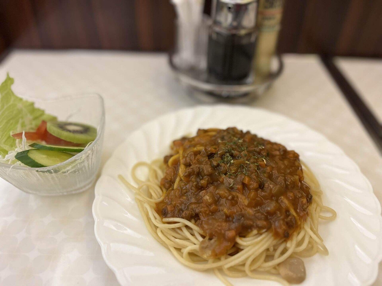 白い皿にやややわらかめのスパゲティ、その上に野菜と挽き肉を煮込んだ濃厚ミートソースがたっぷり。炒め玉ねぎの甘みと肉の旨みが前に出て、口当たりはとろりと優しい。卓上の胡椒や粉チーズで味変するとさらに奥行きが増す。付け合わせのサラダが口をリセットし、またソースに戻りたくなる。派手さはないが安心感のある味わいで、純喫茶らしい一皿だ。