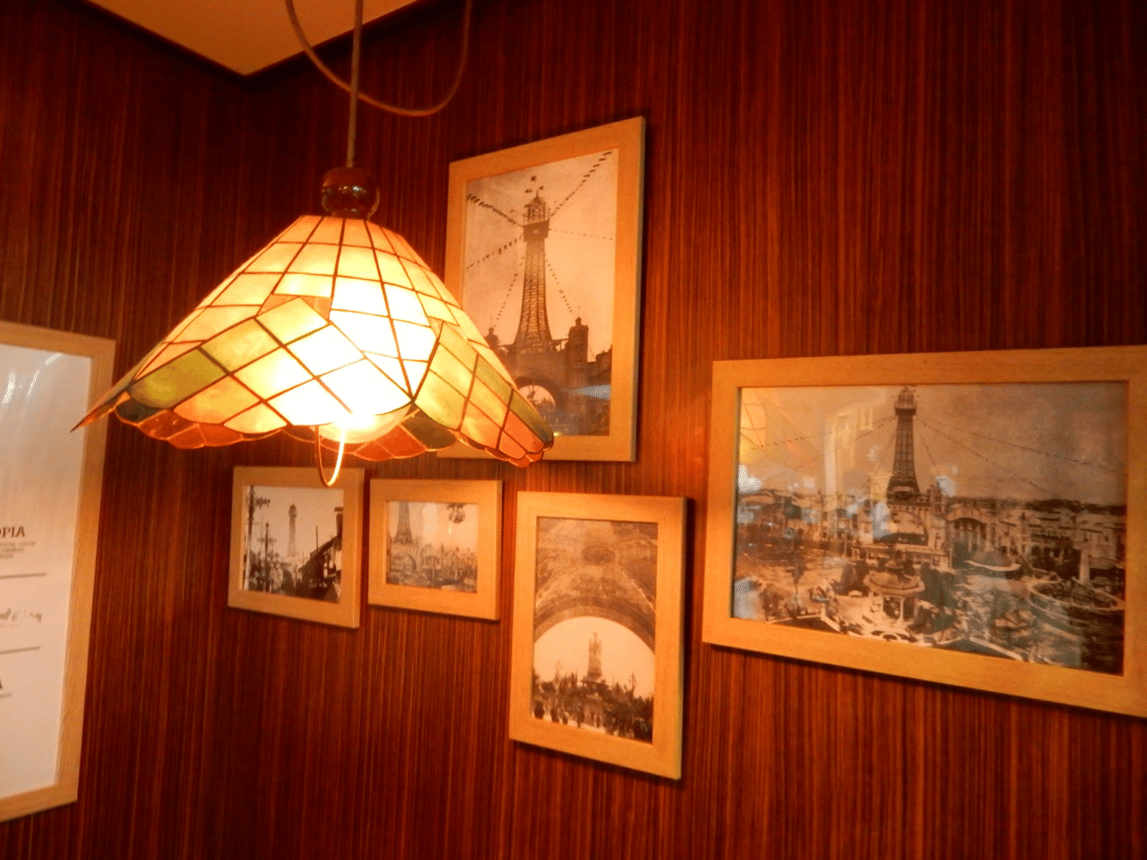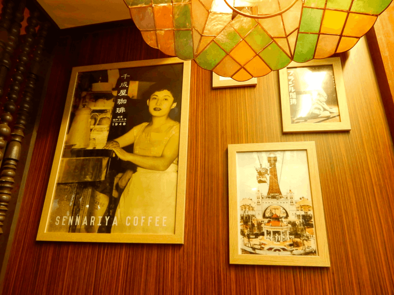 中に入ると、木目の壁がほの暗い。壁には、初代通天閣の写真がいくつも飾られている。光を受けて輝くステンドグラスのランプが、時代の記憶をそっと照らしているようだ。