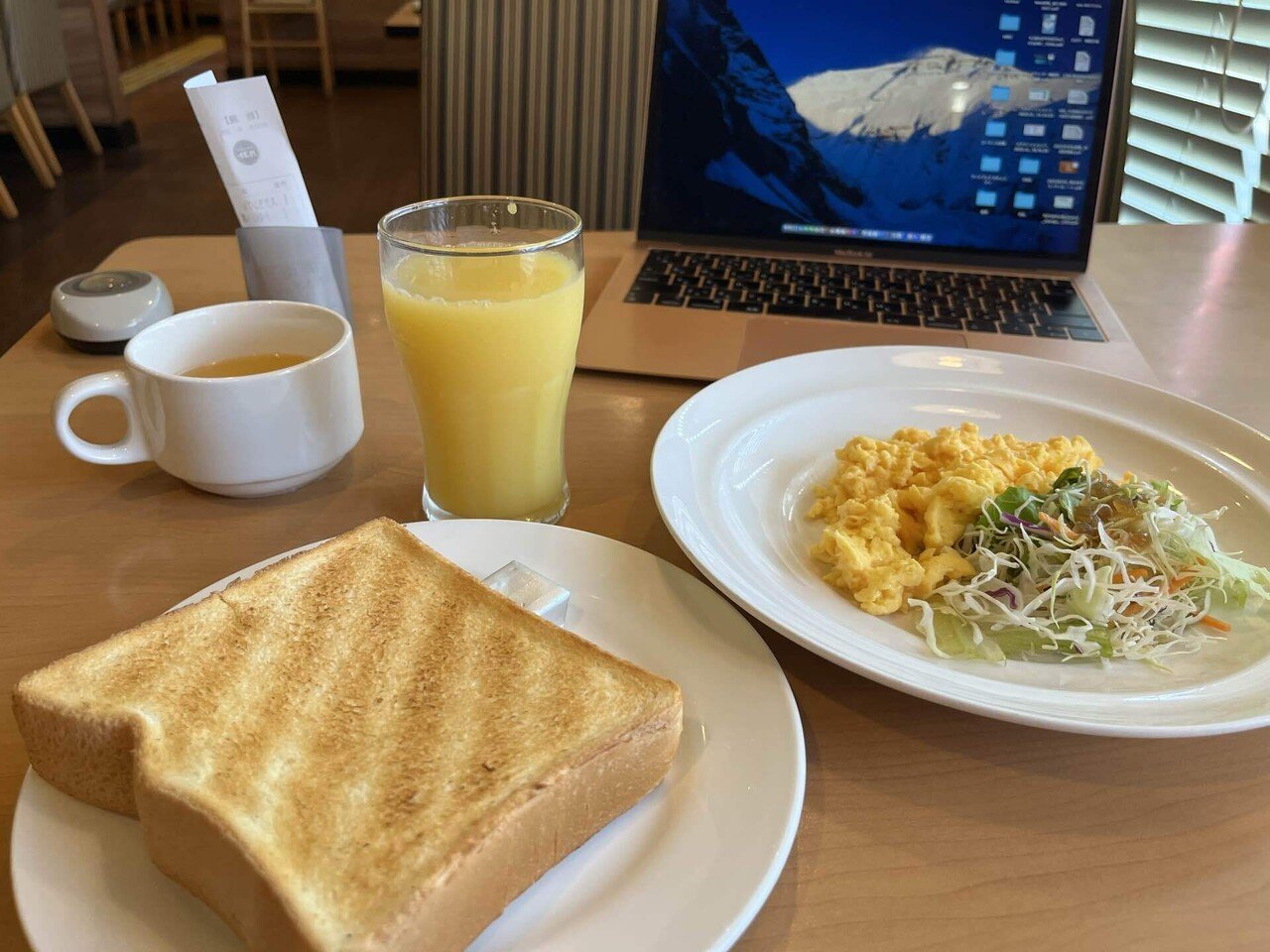 7時40分、到着。この時間から営業してくれてありがたい。しかも冷房が効いてWi-Fiもある。さすがに平日の店内はお年寄りが5組ほどいるくらい。店員さんの姿はなく、好きなテーブルに座り、注文もタブレットでセルフ。