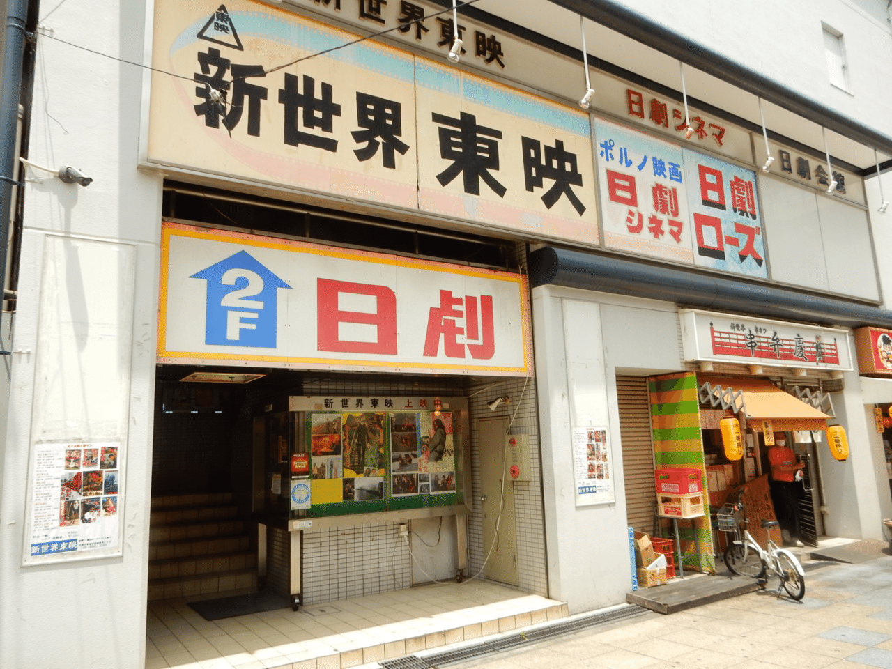 サッパリしたあとも16時まで時間があるので映画を観よう。去年の冬、通りかかって気になっていた新世界東映。昭和30年代にできたらしいが、前身の『日本倶楽部劇場』は明治45年、初代通天閣と同い年。新世界東映は、東映時代劇や任侠映画の新作を上映する封切館だったが、現在は名画座となっている。今は成人映画の『日劇シネマ』と『日劇ローズ』を併設。
