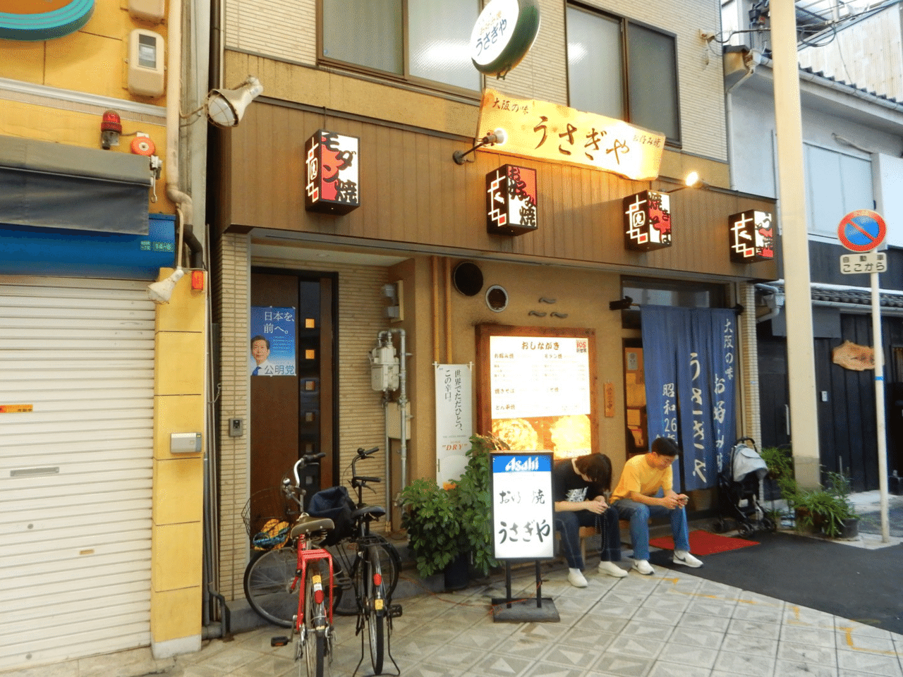 18時過ぎまで眠っていたら通天閣の空に月。今日の晩御飯は何にしようか。ホテルのベランダから新世界を見渡すと、ホテルの目の前に「うさぎや」があった。調べてみると60年以上続く新世界で最古のお好み焼き屋。行ってみよう。