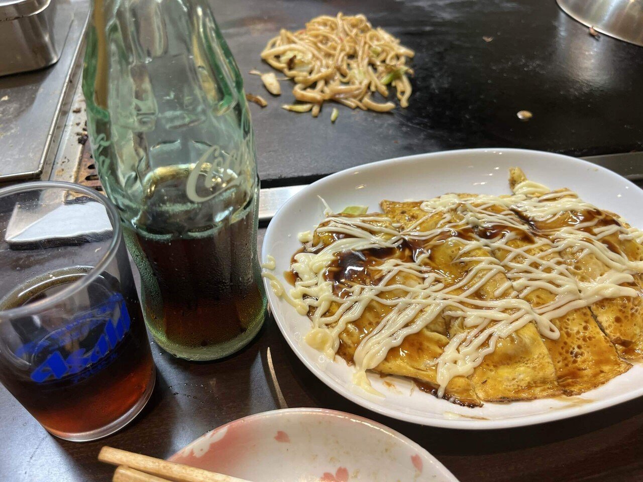 そして珍しいとんぺい焼き。道頓堀でタコ焼き、お好み焼きを食ってるから違う粉もんが食いたい。マヨネーズの甘さが暴力的に美味い。コーラで流し込む。これだけ国際化しながら、支払いは現金のみ。外国の方はカードが使えず大変だ。真のグローバルの夜明けは遠い。