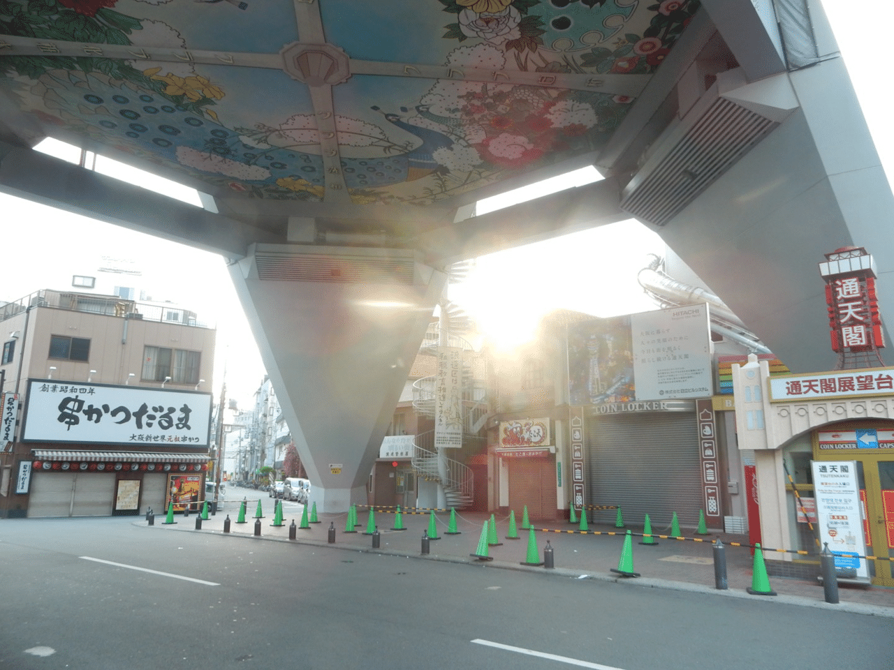 新世界が目覚める前に散策。ローソンは24時間で動いている。本番は昼から。今はストレッチ運動。朝の道頓堀川は1日を始める祝福としてこの上なく大好きだが、通天閣も清々しい。