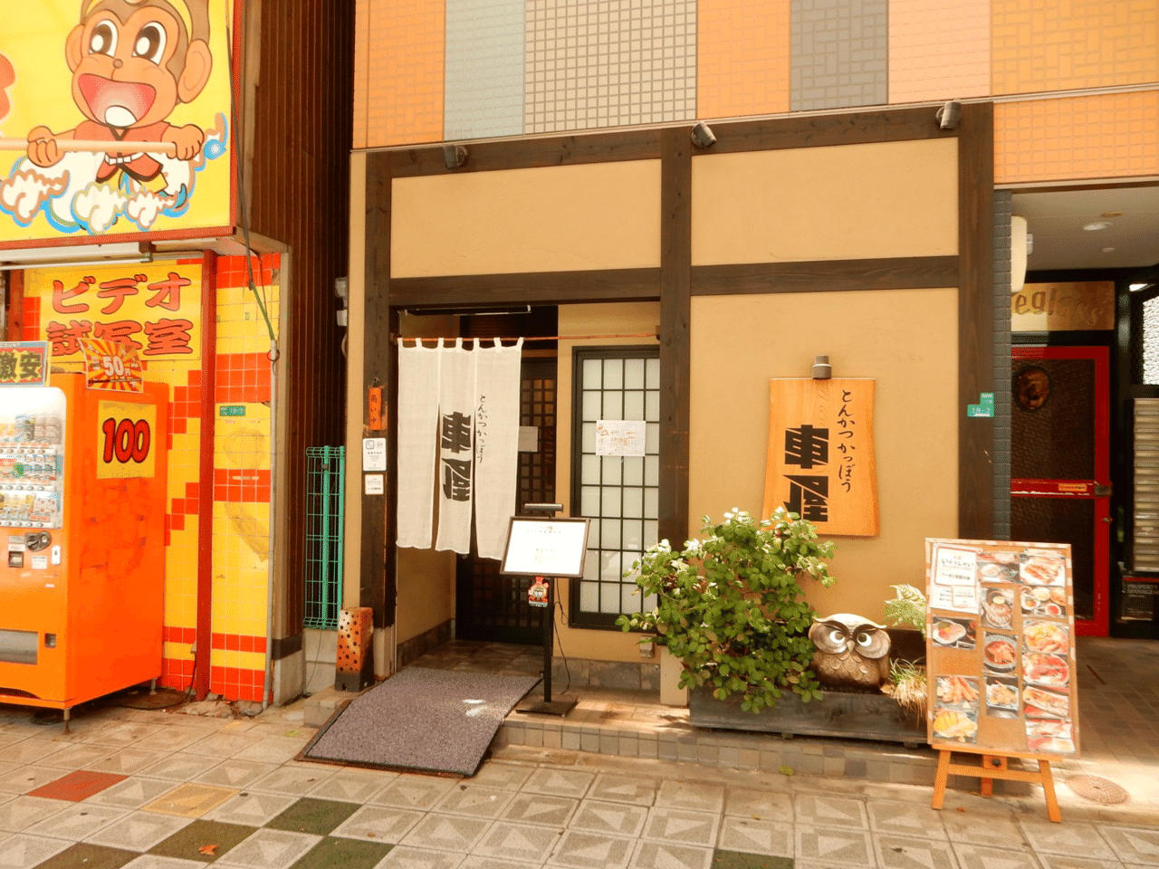 通天閣本通り商店街にフクロウの置物が見えたら「とんかつ割烹 車屋」。2005年の開業。ホテルから徒歩1分。こんな店があるなんて。近そうでまだ遠い新世界。入るのに少し緊張する店構え。
