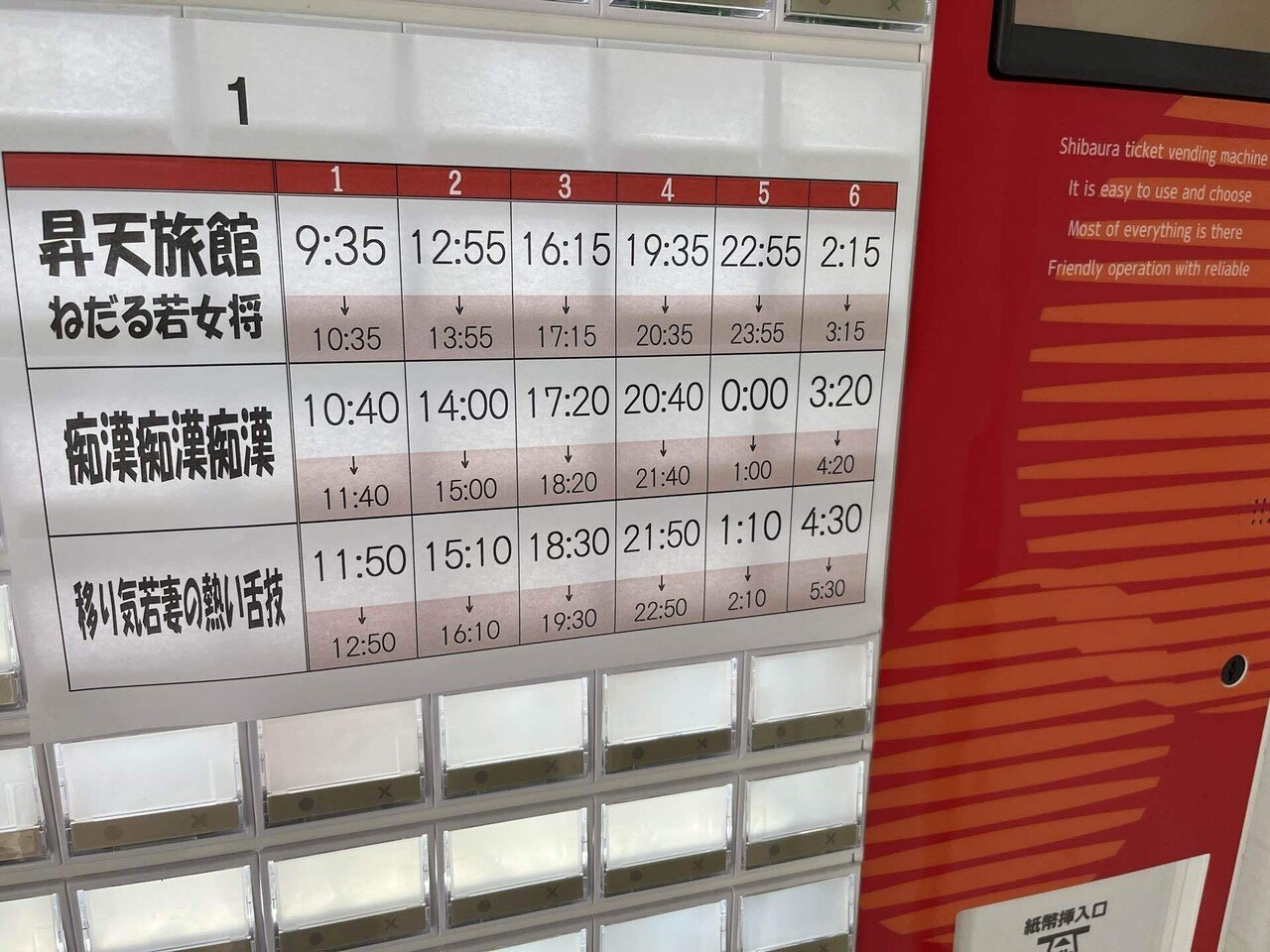 『昇天旅館 ねだる若女将』を観ながら館内を観察していると、先ほどカラダを触ってきたおじいさんは別の客と席でヒソヒソ話している。次々と女装した男性客が入ってきたので居づらくなり映画館を出た。外は少し薄暗くなっていた。