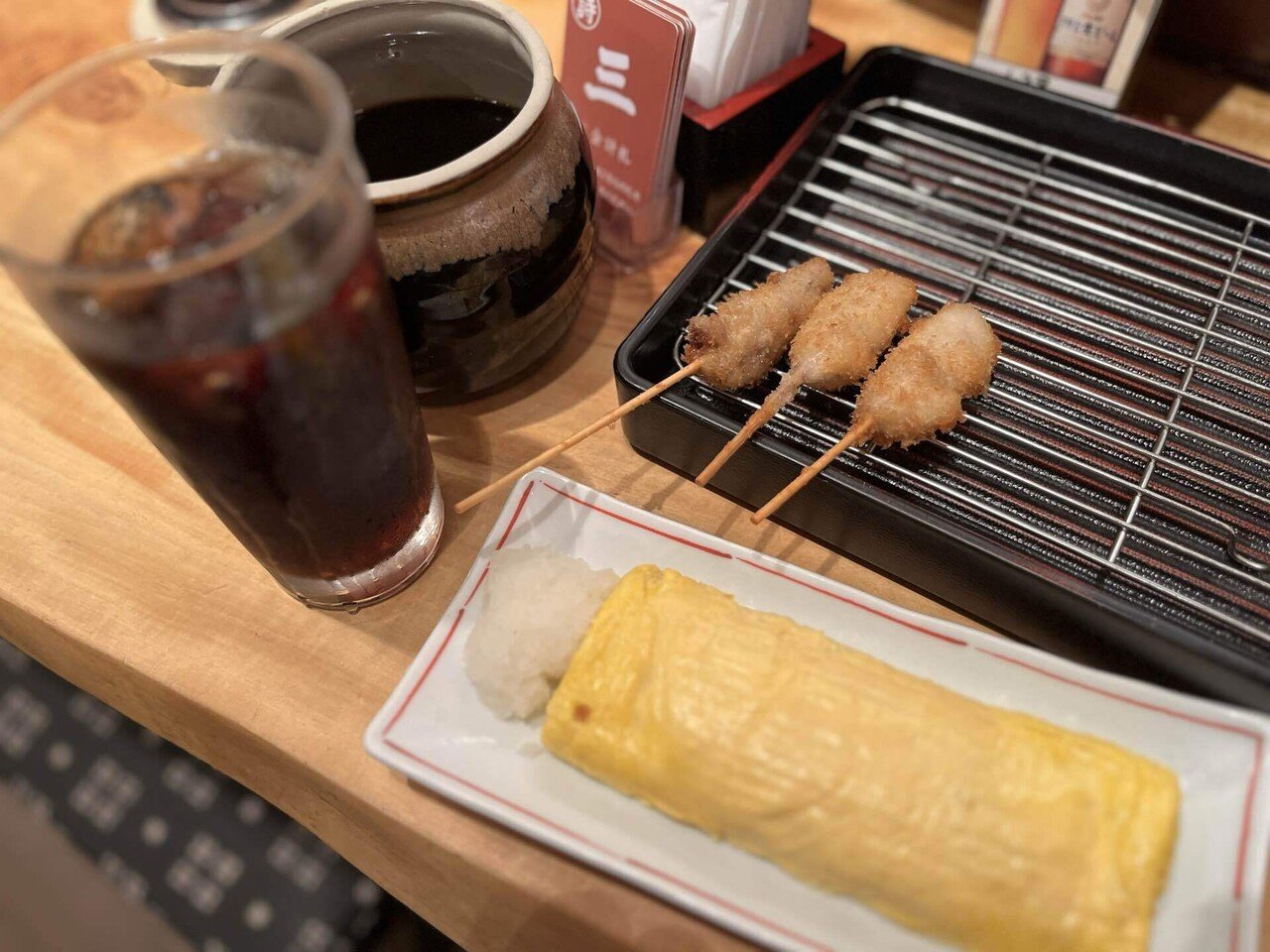 串カツは7本。牛、ホルモン、鶏もも、絞甲イカ、メンチカツ、まぐろ、ホタテ貝柱。そこに、だし巻き卵とコーラをセットに晩酌。やはり場所が串カツを美味しくさせる。東京に支店があってもこうはいかない。場所や空気も大切な調味料。